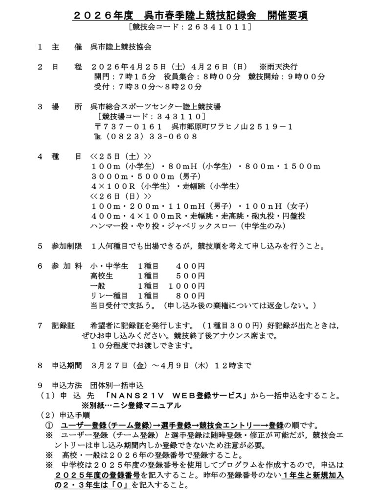 ※本記録会は、呉地区高等学校総合体育大会(地区総体)と同会場で同時に行われます