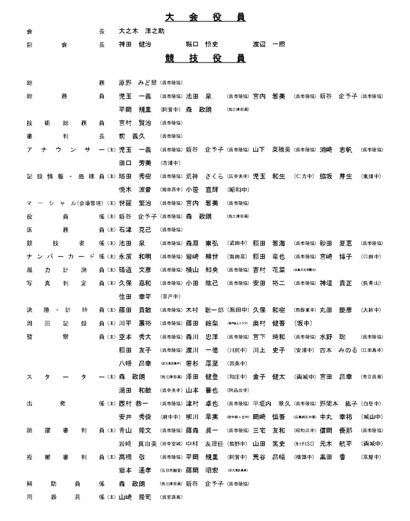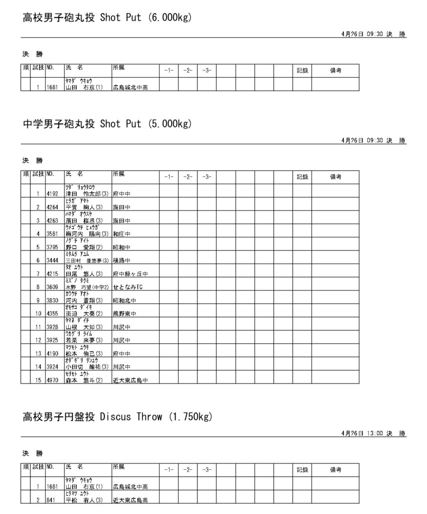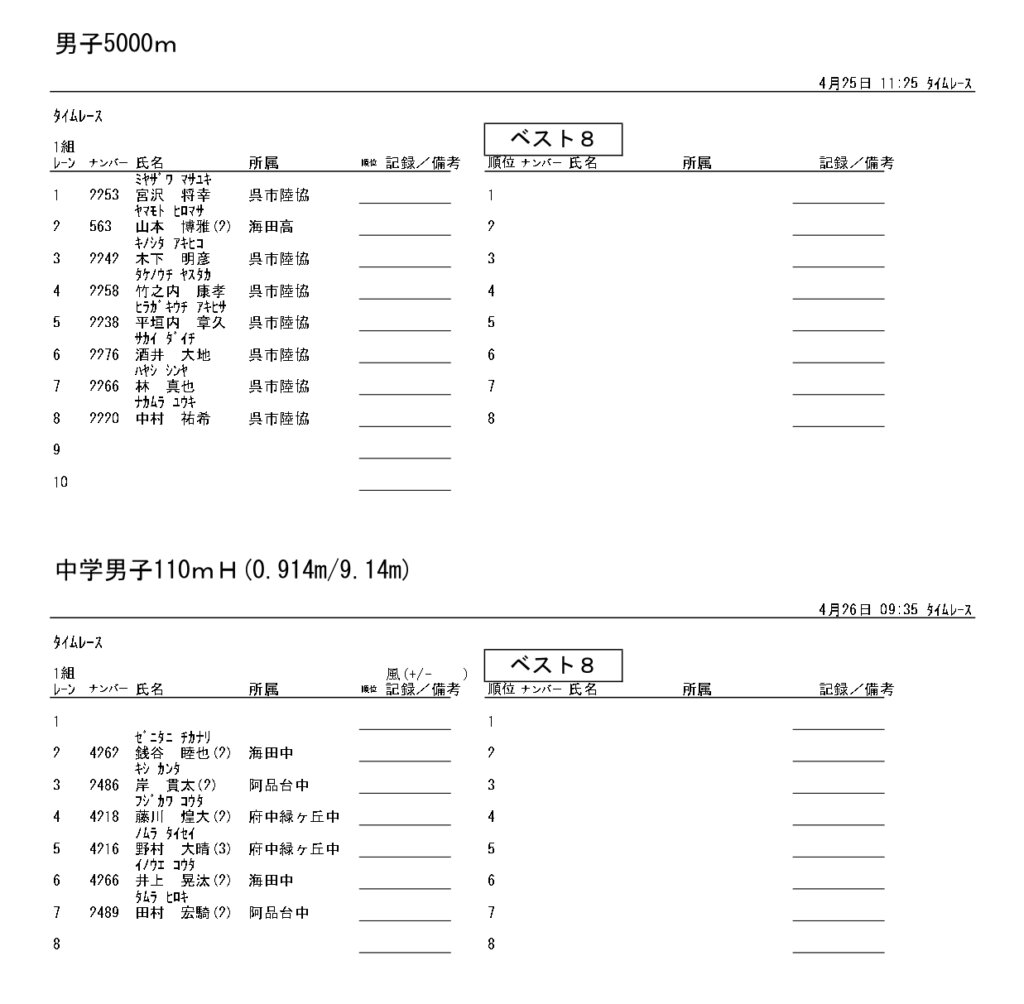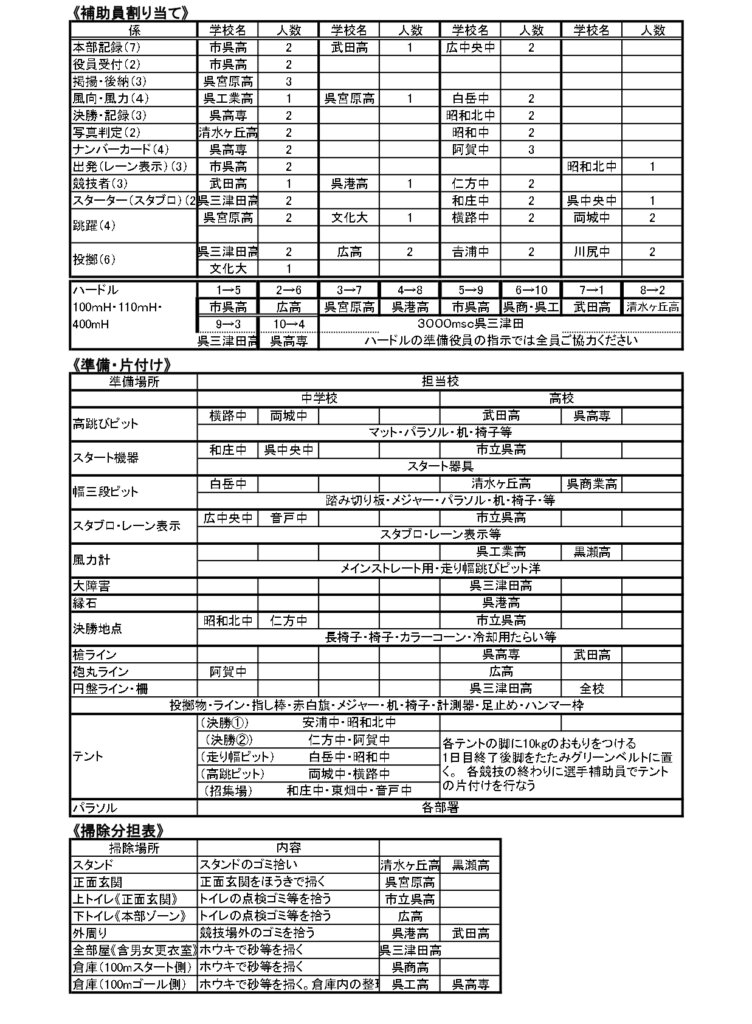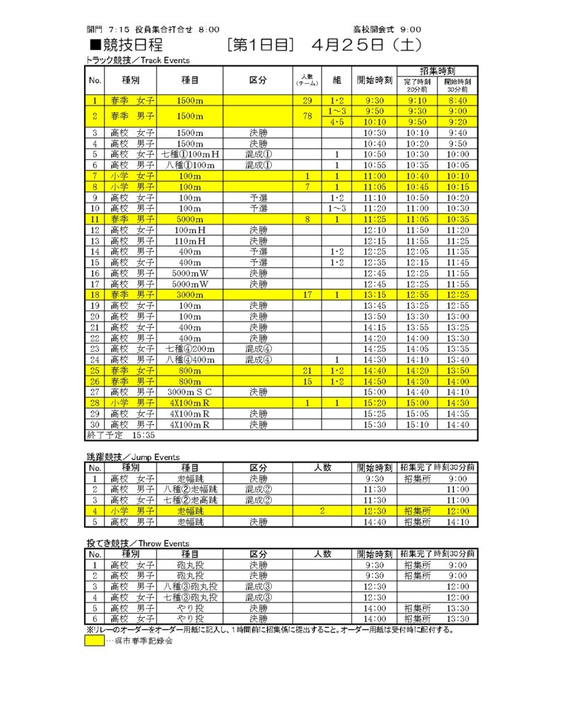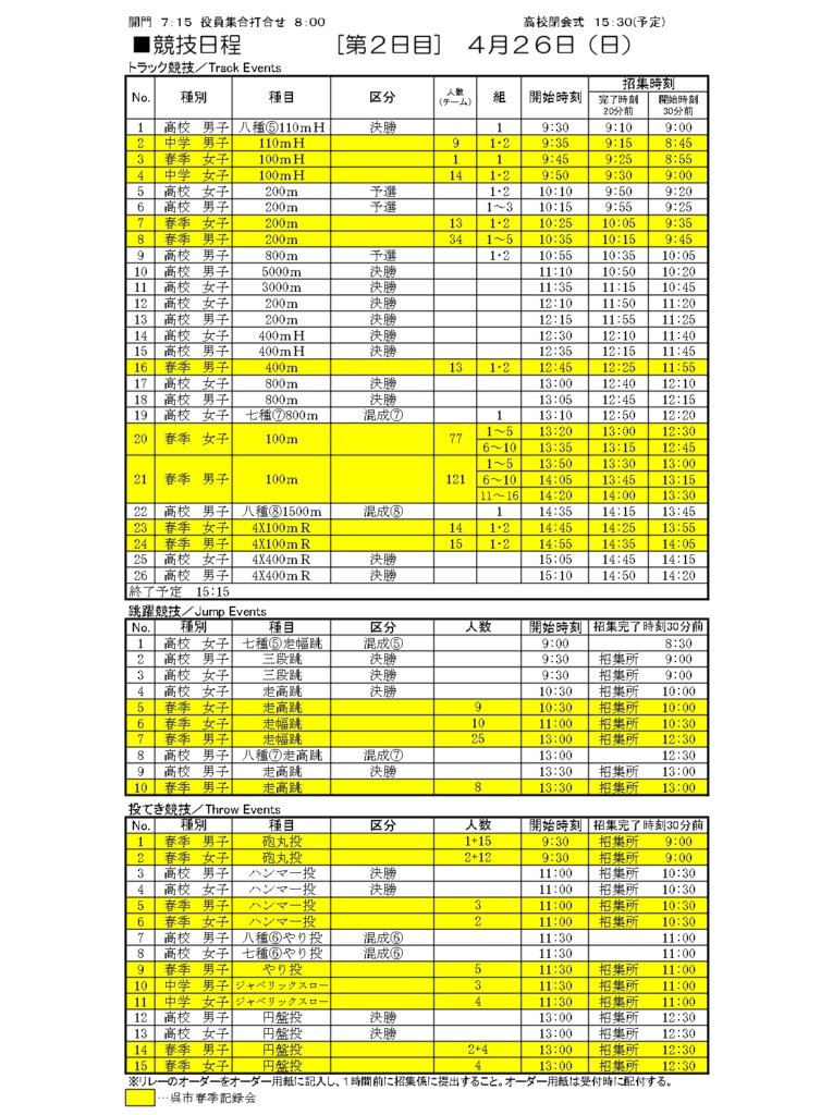 地区総体のタイムテーブルは記録会種目には支障のないよう組んでいますが、選手のみなさんは高校種目と間違えないよう、個人・団体でご準備ください