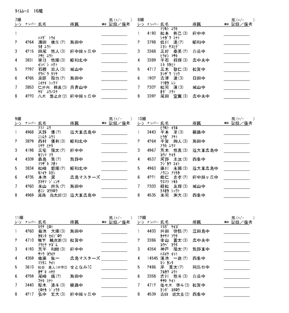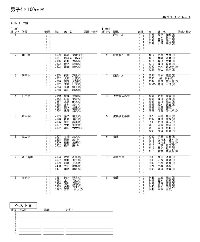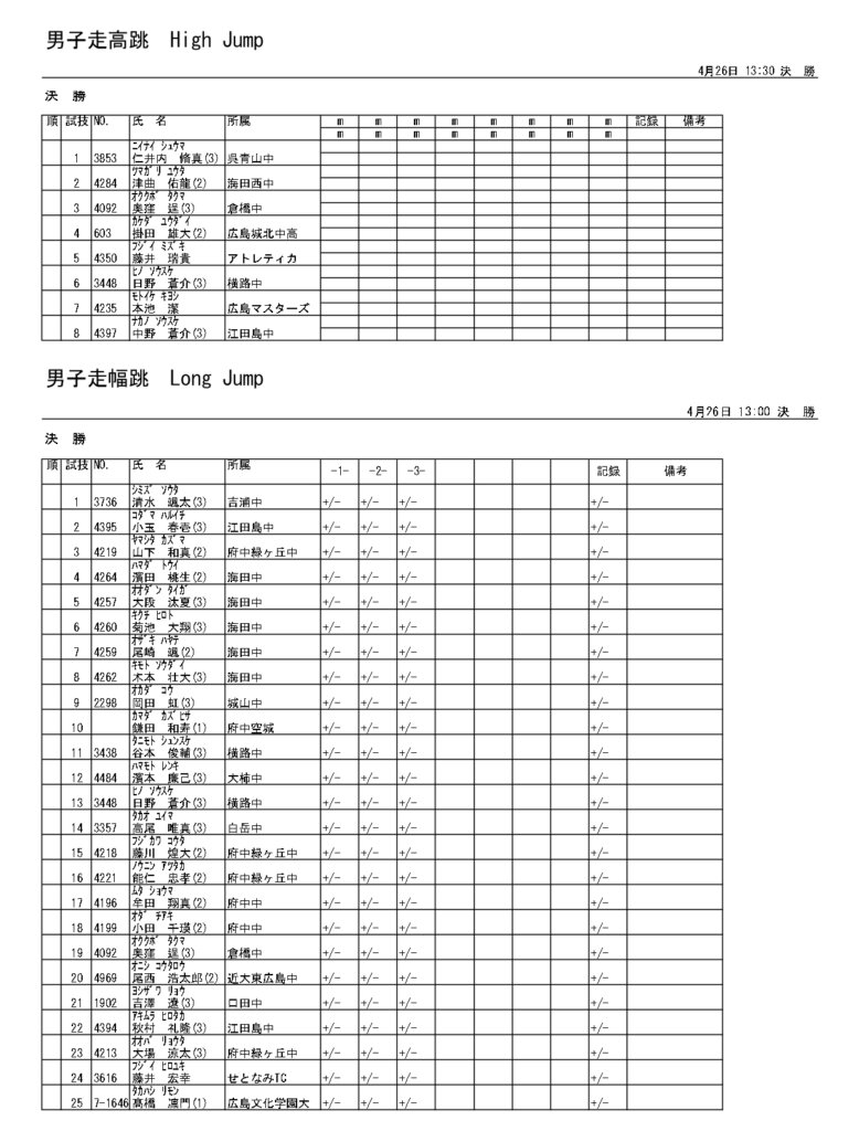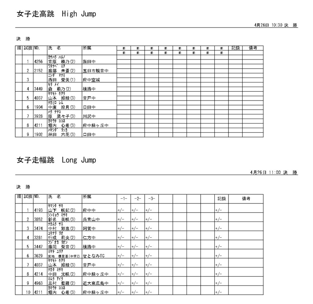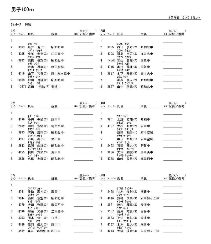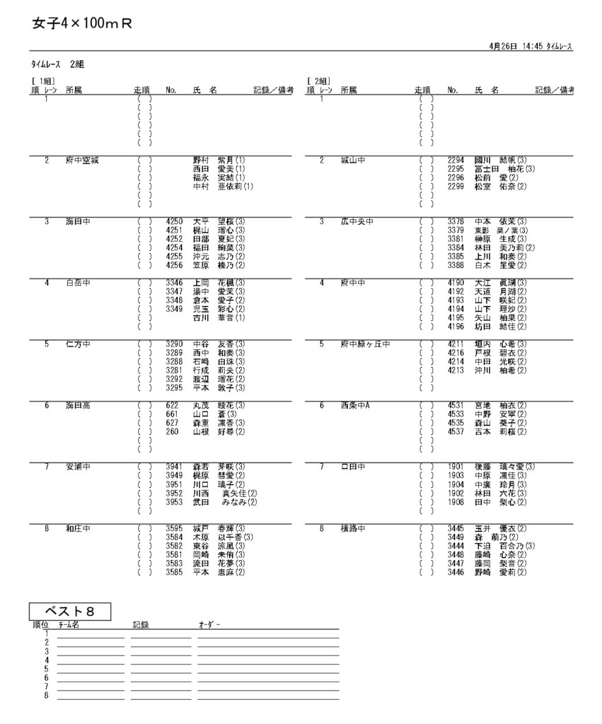 地区総体のタイムテーブルは記録会種目には支障のないよう組んでいますが、選手のみなさんは高校種目と間違えないよう、個人・団体でご準備ください