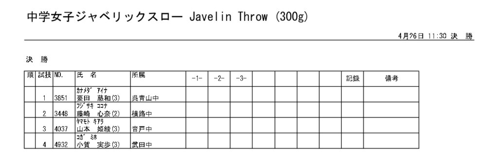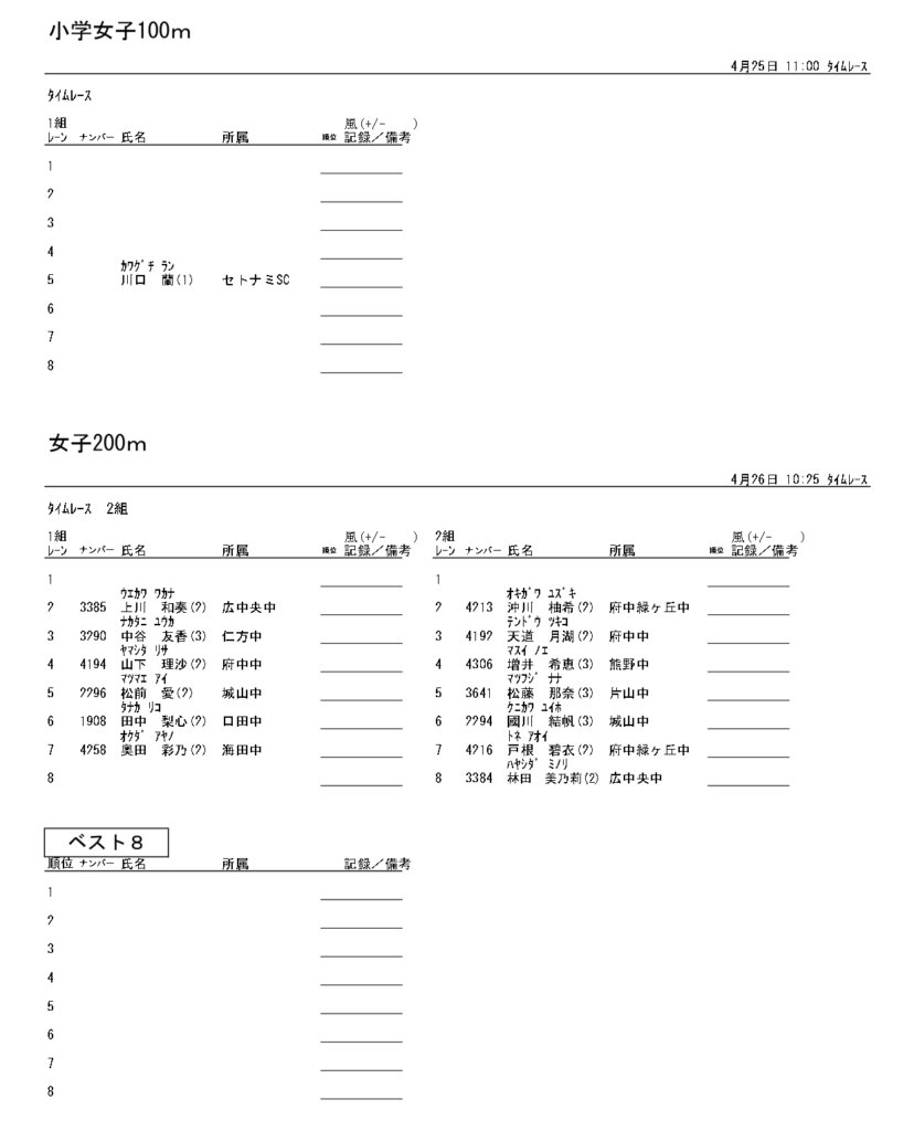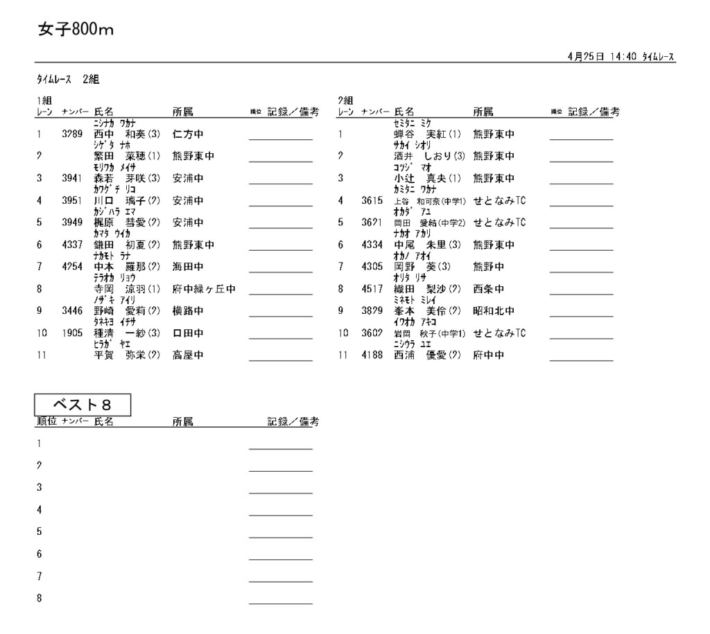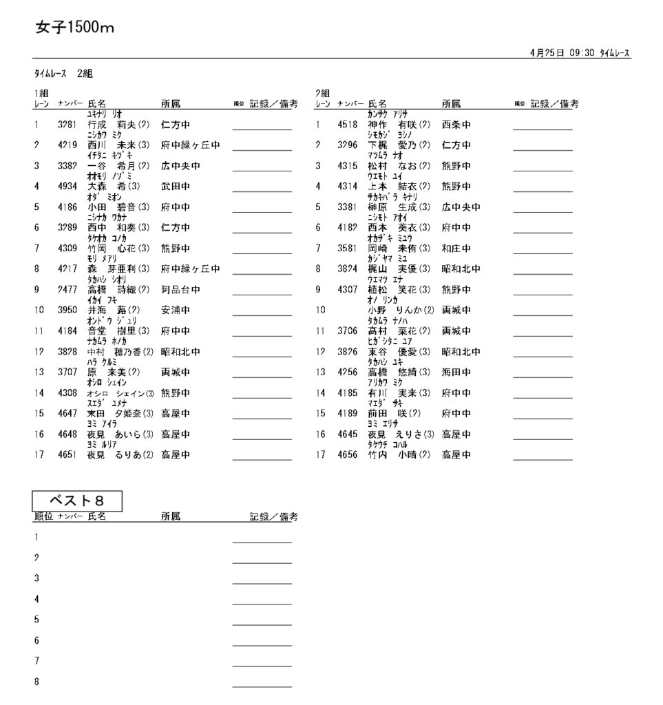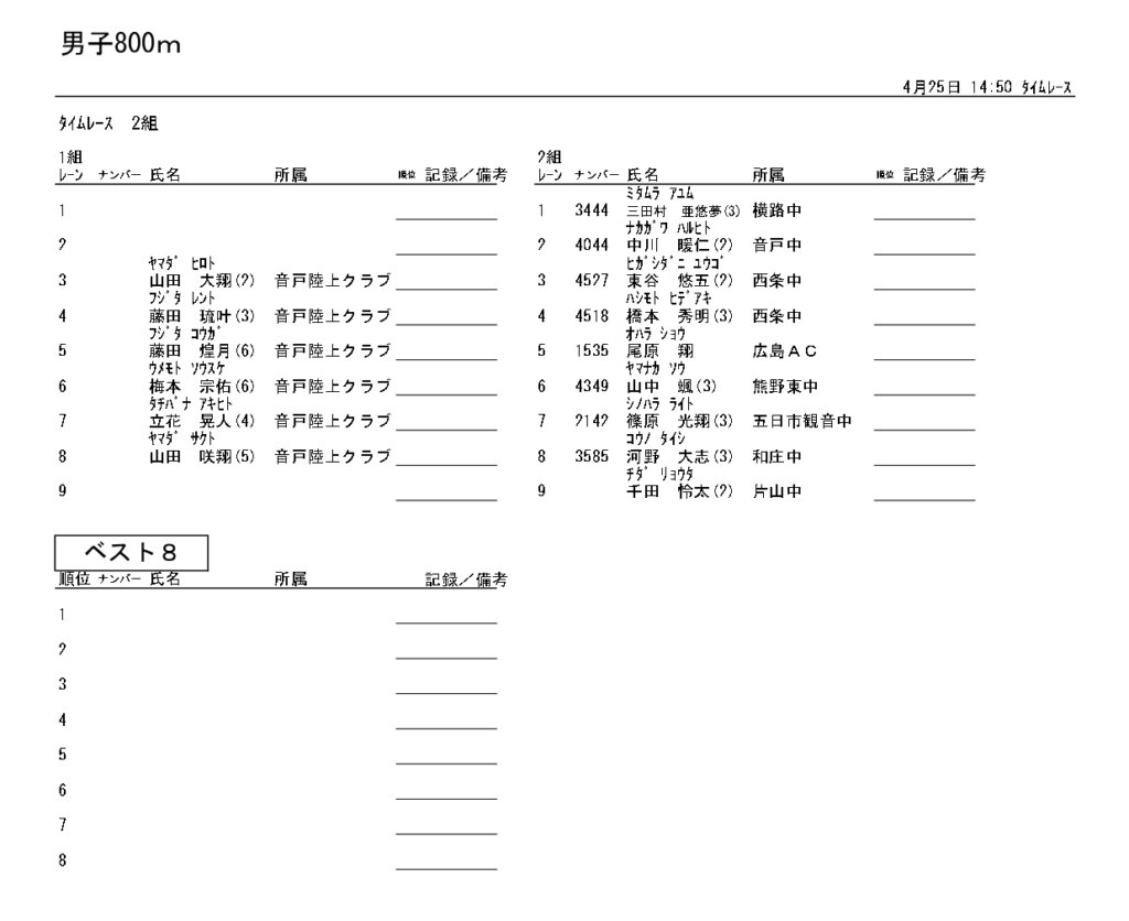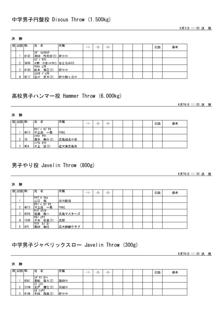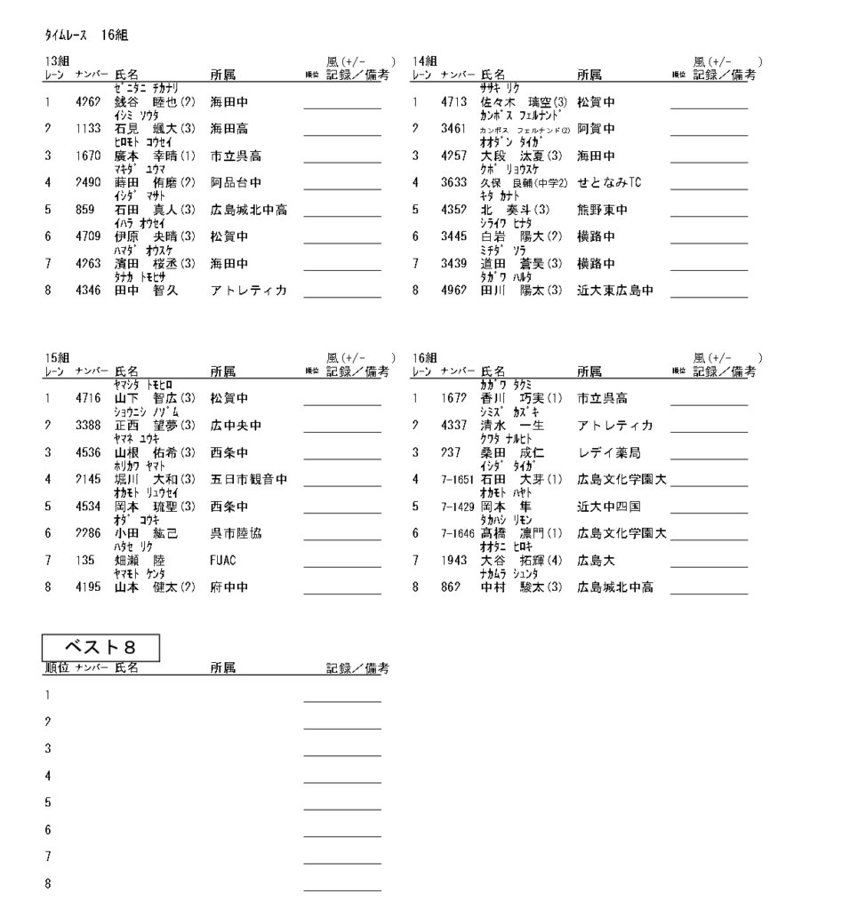 地区総体のタイムテーブルは記録会種目には支障のないよう組んでいますが、選手のみなさんは高校種目と間違えないよう、個人・団体でご準備ください